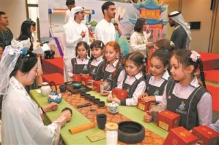 在互动环节,国风拍照、古风拓印、中式插花等体验区人头攒动:来自迪拜慈善小学的孩子们争相展示着他们手中的蛇年生肖玩偶,体验着投壶游艺带来的喜悦心情;一名阿拉伯小伙儿饶有兴致地学做起桃花样式的茶果子,随着一朵花蕊点缀其间,他的作品赢得了在场观众的一阵掌声;在书法展位,阿联酋友好人士赛义德熟练地拿起毛笔,流畅地写下“我爱中国”4个汉字,高兴地与一旁的中国书法家合影留念……“我喜爱中国文化,喜欢过春节,这是一个世界性的节日!”赛义德对记者说。